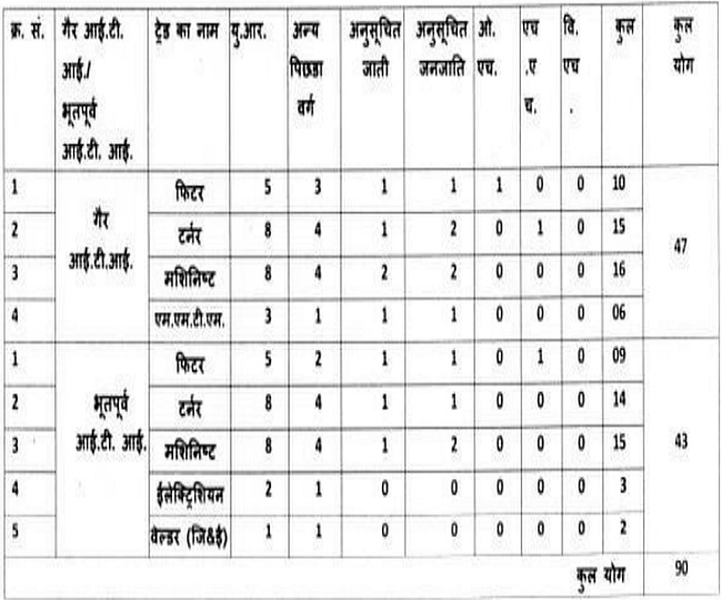 इस भर्ती के माध्यम से कुल 90 रिक्त पदों पर नियुक्तियां की जाएंगी। इसमें से नॉन आईटीआई पदों के लिए कुल 47 पद और आईटीआई पदों के लिए कुल 43 पद आरक्षित हैं।