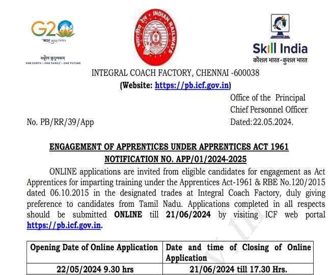 Apprenticeship 2024: इंटीग्रल कोच फैक्ट्री में अप्रेंटिसशिप पदों पर निकली भर्ती, 21 जून तक कर सकते हैं अप्लाई