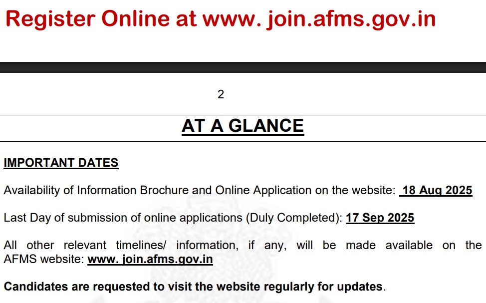 इस भर्ती में शामिल होने के लिए ऑफिशियल वेबसाइट join.afms.gov.in पर जाकर आवेदन करना होगा। आवेदन पत्र भरने के साथ सभी वर्गों से आने वाले उम्मीदवारों को निर्धारित 200 रुपये शुल्क का भुगतान अनिवार्य रूप से करना है। बिना फीस के भरे गए फॉर्म स्वीकार नहीं होंगे। आवेदन फीस ऑनलाइन माध्यम से जमा की जा सकती है।