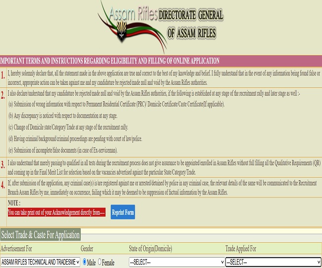 इस भर्ती में आवेदन के लिए सबसे पहले आधिकारिक वेबसाइट assamrifles.gov.in पर जाकर भर्ती से संबंधित लिंक पर क्लिक करें। इसके बाद नए पोर्टल पर मांगी गई डिटेल भरकर आवेदन प्रक्रिया पूर्ण करें। इसके बाद अभ्यर्थी वर्ग के अनुसार निर्धारित शुल्क (यदि लागू हो) जमा करें और फॉर्म को सबमिट करके उसके एक प्रिंटआउट निकालकर अपने पास सुरक्षित रख लें।