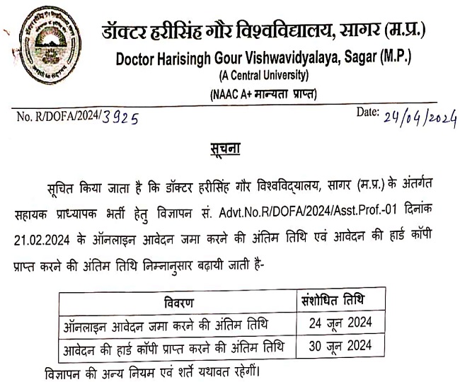 डॉ. हरीसिंह गौर विश्वविद्यालय में असिस्टेंट प्रोफेसर के 88 रिक्त पदों भर्ती निकाली गई है। जो भी अभ्यर्थी इस भर्ती में भाग लेना चाहते हैं और इसके लिए योग्यता रखते हैं वे ऑनलाइन माध्यम से 22 जून तक एप्लीकेशन फॉर्म भर सकते हैं। ऑनलाइन आवेदन पत्र भरने के बाद आपको उसकी हार्ड कॉपी 30 जून तक निर्धारित पते पर अनिवार्य रूप से भेजनी होगी।