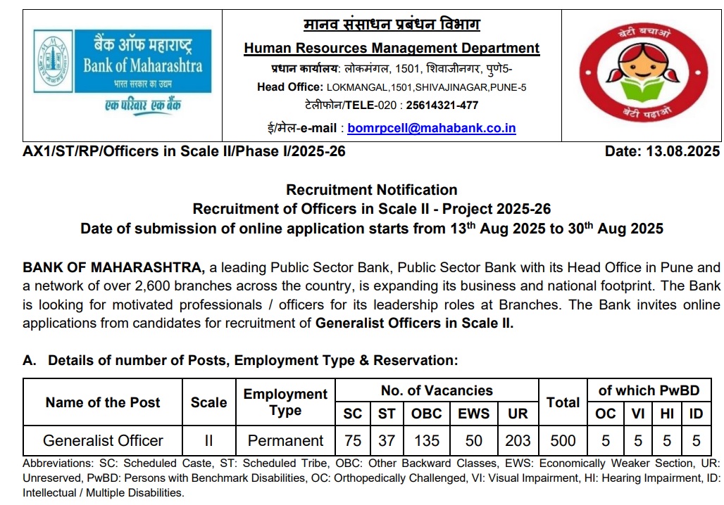 बैंक ऑफ महाराष्ट्र में Generalist Officer Scale II के 500 रिक्त पदों को भरने के लिए भर्ती निकाली गई है। ऐसे में जो भी अभ्यर्थी इस भर्ती में भाग लेना चाहते हैं वे 30 अगस्त 2025 तक ऑनलाइन माध्यम से फॉर्म भर सकते हैं। आवेदन पत्र केवल ऑनलाइन ही भरा जा सकता है अन्य किसी भी प्रकार से फॉर्म स्वीकार नहीं होंगे।