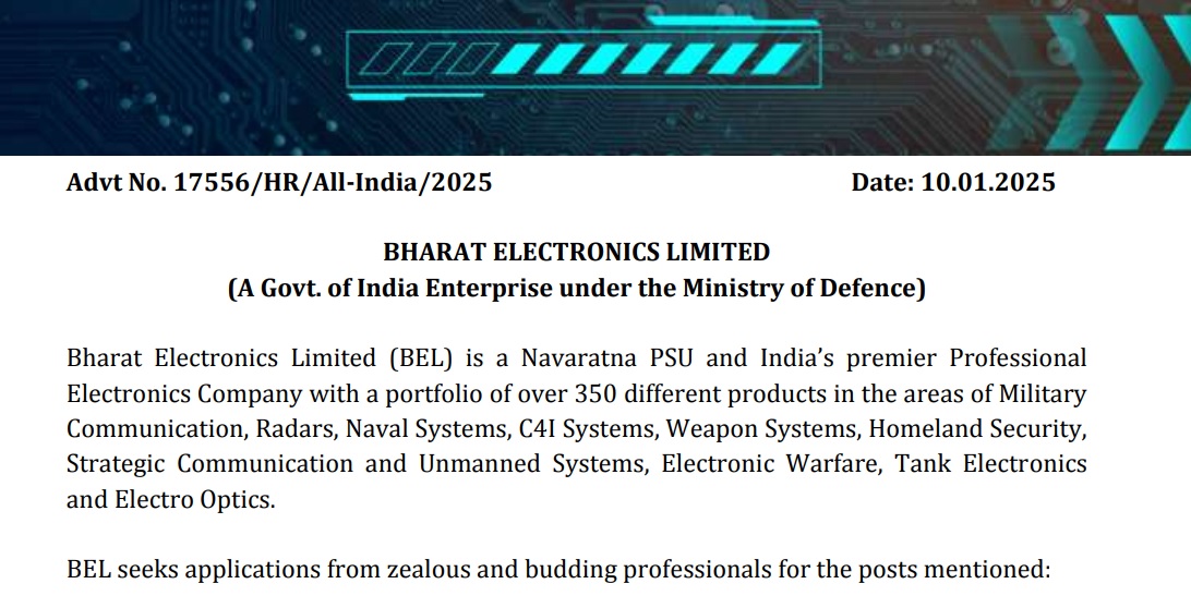 BEL Recruitment 2025: बीईएल में प्रोबेशनरी इंजीनियर पदों पर परमानेंट सरकारी नौकरी पाने का मौका, 31 जनवरी तक कर सकते हैं अप्लाई