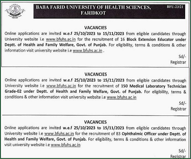 BFUHS Recruitment 2023: बाबा फरीद यूनिवर्सिटी ऑफ हेल्थ साइंसेस में 249 सरकारी नौकरियां, आवेदन 15 नवंबर तक