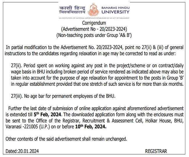 जॉब डेस्क, नई दिल्ली। बनारस हिंदू विश्वविद्यालय (BHU) में नॉन टीचिंग ग्रुप A व ग्रुप B के रिक्त पदों पर भर्ती चल रही है। इस भर्ती के लिए आवेदन की अंतिम तिथि आज यानी 22 जनवरी निर्धारित की गयी थी जिसे अब एक्सटेंड करने की घोषणा की गयी है। बीएचयू की ओर नोटिफिकेशन जारी कर इस भर्ती के लिए आवेदन की अंतिम तिथि को 5 फरवरी 2024 तक एक्सटेंड कर दिया गया है।