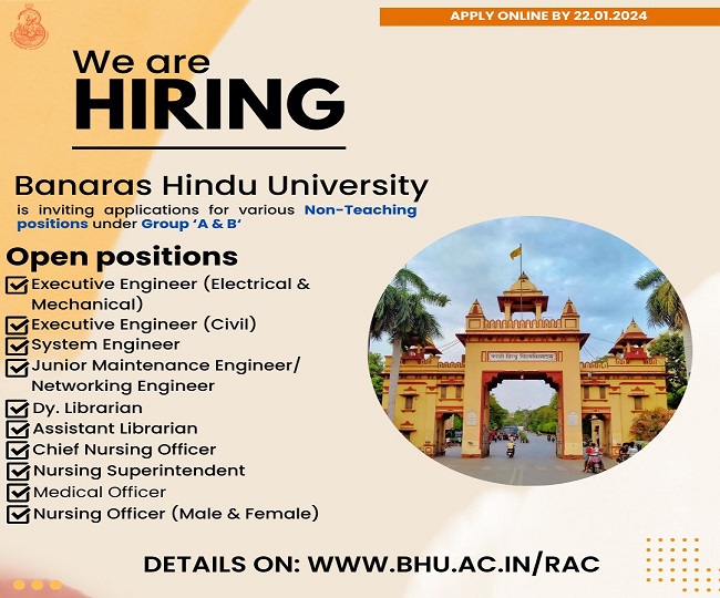 जॉब डेस्क, नई दिल्ली। उत्तर प्रदेश / वाराणसी में सरकारी नौकरी के इच्छुक उम्मीदवारों के लिए खुशखबरी। काशी हिंदू विश्वविद्यालय (BHU) ने नॉन-टीचिंग कटेगरी के अंतर्गत ग्रुप ए और ग्रुप बी के कुल 258 पदों पर भर्ती के लिए विज्ञापन जारी किया है। विश्वविद्यालय द्वारा जारी विज्ञापन (सं. 20/2023-2024) के अनुसार नर्सिंग ऑफिसर (मेल, फीमेल), मेडिकल ऑफिसर, नर्सिंग सुप्रींटेंडेट, चीफ नर्सिंग ऑफिसर, डिप्टी/असिस्टेंट लाइब्रेरियन, जूनियर मेंटेनेंस इंजीनियर / नेटवर्किंग इंजीनियर, सिस्टम इंजीनियर और एग्जीक्यूटिव इंजीनियर (सिविल, इलेक्ट्रिकल एण्ड मेकेनिकल) के पदों पर भर्ती (BHU Recruitment 2024) की जानी है।