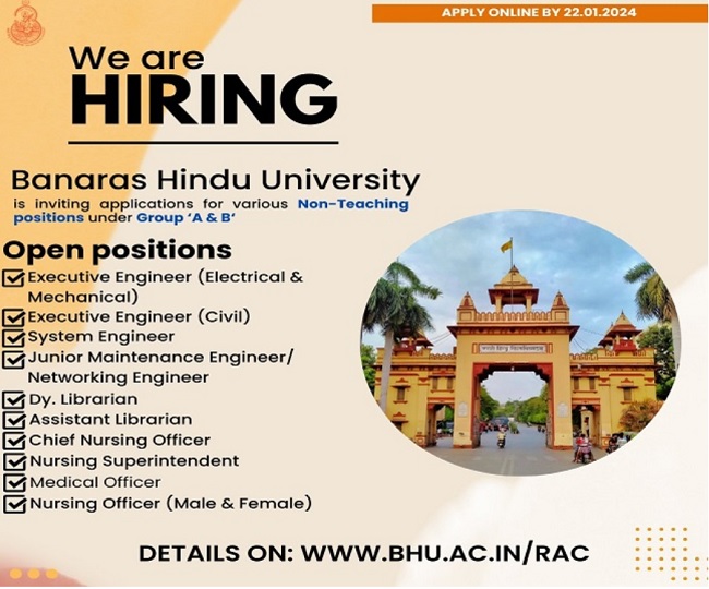 जॉब डेस्क, नई दिल्ली। बनारस हिंदू विश्वविद्यालय (BHU) में नॉन टीचिंग पदों पर भर्ती चल रही है। इस भर्ती में शामिल होने के लिए आवेदन की अंतिम 22 जनवरी 2024 तय की गयी है। जो अभ्यर्थी इस भर्ती के लिए योग्य हैं और किसी कारणवश अभी तक आवेदन नहीं कर सके हैं उनके पास अंतिम मौका है।