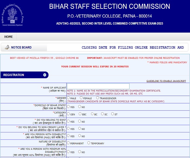 बिहार पंचायत सचिव के 3500 से अधिक पदों समेत अन्य पदों वाली बिहार इंटर लेवल परीक्षा 2023 के लिए उम्मीदवार बीएसएससी की आधिकारिक वेबसाइट, onlinebssc.com पर उपलब्ध कराए गए ऑनलाइन अप्लीकेशन फॉर्म के माध्यम से आवेदन कर सकते हैं। आवेदन प्रक्रिया 27 सितंबर से ही चल रही है और उम्मीदवार 9 नवंबर 2023 तक अपना रजिस्ट्रेशन कर सकते हैं। इसी तिथि तक उम्मीदवारों को निर्धारिक परीक्षा शुल्क का भी भुगता करना होगा। इसके बाद उम्मीदवार उम्मीदवार 11 नवंबर तक अपना अप्लीकेशन सबमिट कर सकेंगे।