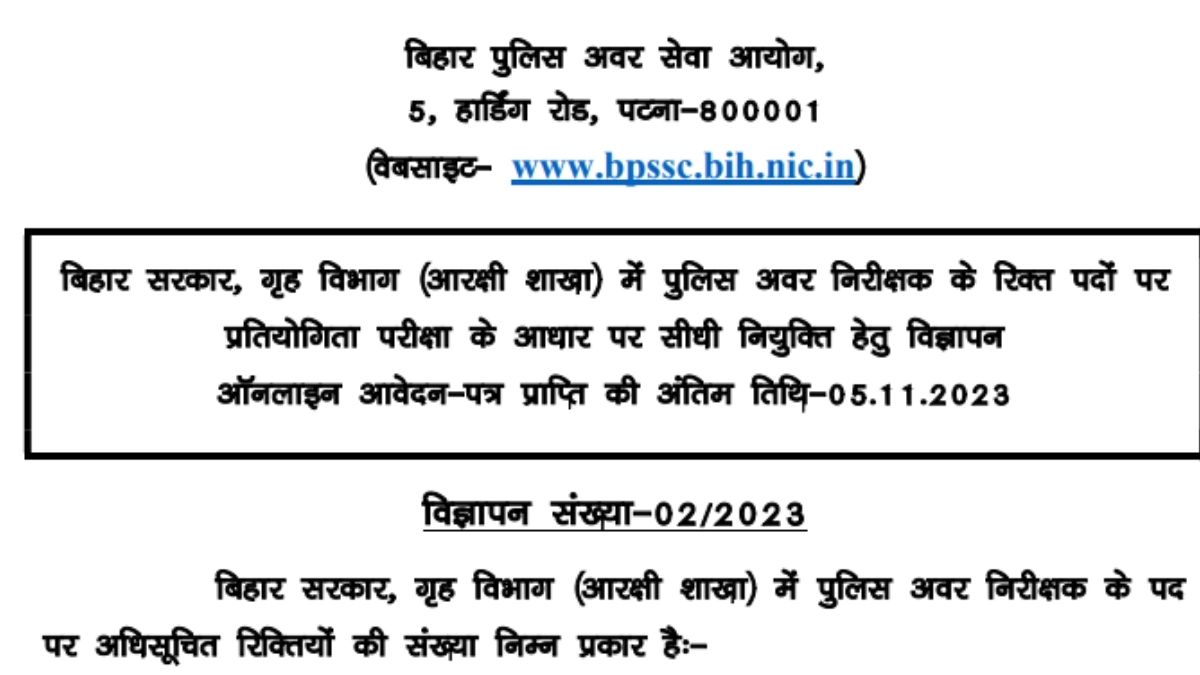 जॉब डेस्क, नई दिल्ली। Bihar Police Bharti 2023: बिहार पुलिस में एसआई के पदों पर भर्ती की ख्वाहिश रखने वाले युवाओं के पास शानदार मौका है। बिहार सबऑर्डिनेट सर्विस सेलेक्शन कमीशन (Bihar Police Subordinate Services Commission, BPSSC) की ओर से बिहार पुलिस सब इंस्पेक्टर पदों की भर्ती निकाली गई है। आज यानी कि 05 अक्टूबर, 2023 से इन पदों के लिए ऑनलाइन रजिस्ट्रेशन की प्रक्रिया शुरू हो रही है। अब ऐसे में, जो भी कैंडिडेट्स इन पदों के लिए अप्लाई करना चाहते हैं, वे आधिकारिक वेबसाइट bpssc.bih.nic.in पर जाकर अप्लाई कर सकते हैं।