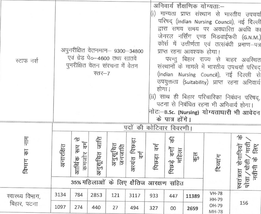 बिहार में स्टाफ नर्स के 11389 रिक्त पदों को भरने के लिए भर्ती निकाली गई है। जो भी उम्मीदवार जनरल नर्सिंग एवं मिडवाइफरी (GNM) या बीएससी नर्सिंग उत्तीर्ण हैं वे निर्धारित अंतिम तिथि 23 मई तक या उससे पहले ऑनलाइन माध्यम से फॉर्म भर सकते हैं। एप्लीकेशन फॉर्म ऑफिशियल वेबसाइट btsc.bihar.gov.in पर या इस पेज दिए लिंक से भरा जा सकता है।
