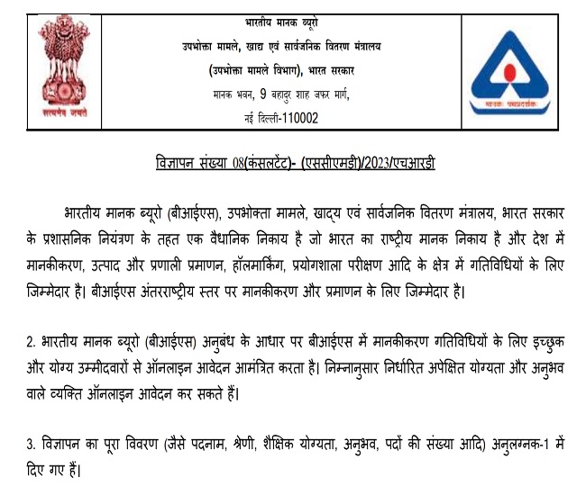 BIS Recruitment 2024: भारतीय मानक ब्यूरो में कंसल्टेंट के पदों पर निकली भर्ती, bis.gov.in पर भर सकते हैं ऑनलाइन फॉर्म