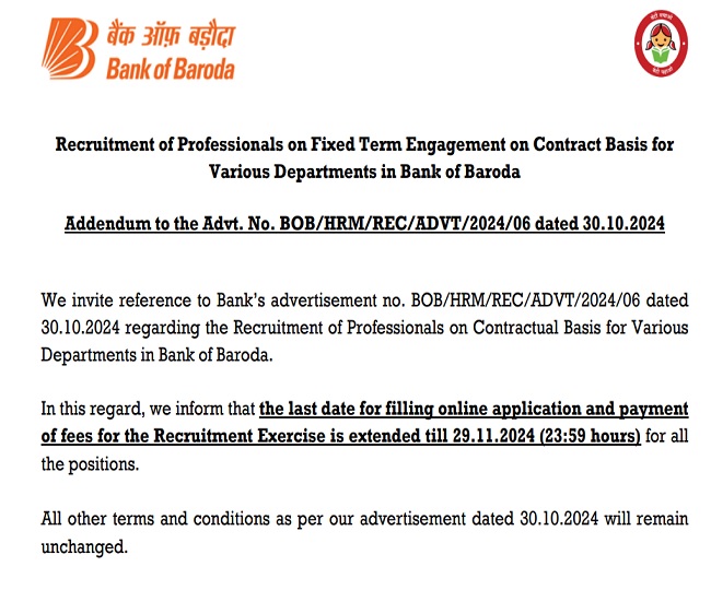 BOB Recruitment 2024: बैंक ऑफ बड़ौदा भर्ती के लिए अंतिम तिथि 29 नवंबर तक बढ़ी, bankofbaroda.in पर ऑनलाइन भर सकते हैं फॉर्म