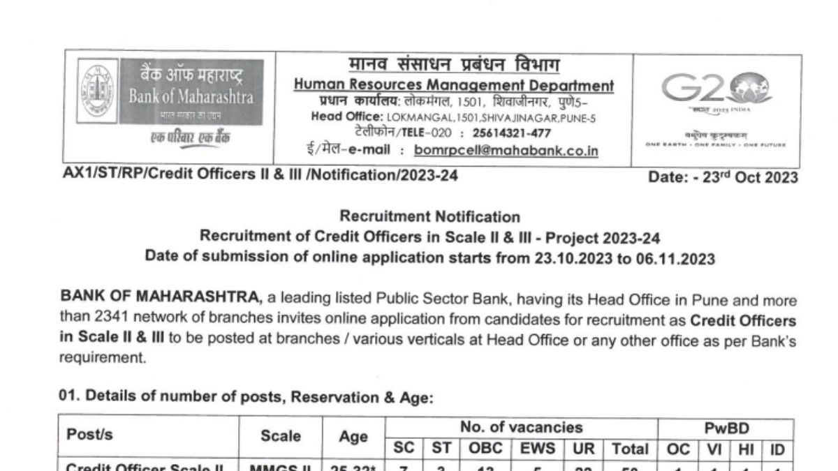 BOM Recruitment 2023: बैंक ऑफ महाराष्ट्र ने क्रेडिट ऑफिसर के पदों पर निकाली भर्ती, 6 नवंबर तक करें आवेदन