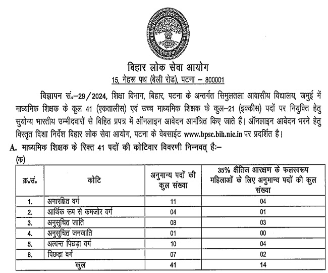 BPSC Recruitment 2024: सिमुलतला रेजिडेंशियल स्कूल में शिक्षक भर्ती के लिए नोटिफिकेशन जारी, आवेदन 25 अप्रैल से होंगे शुरू