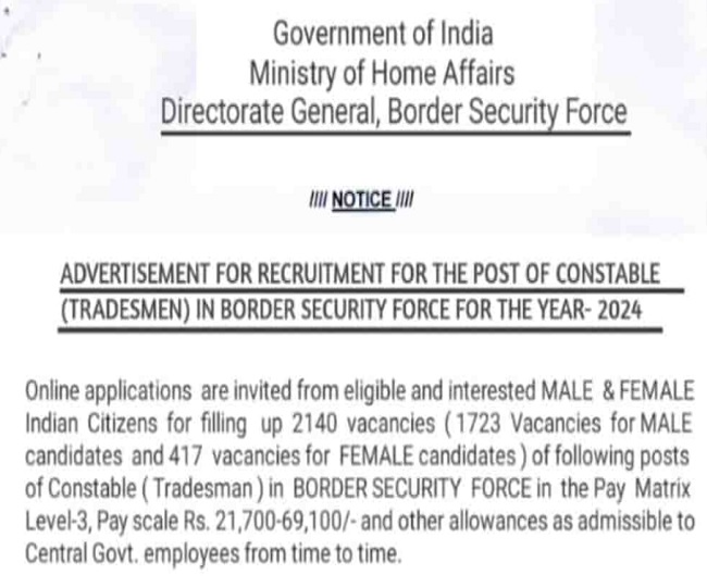 BSF Tradesman Recruitment 2024: बीएसएफ में ट्रेड्समैन के 2140 पदों पर भर्ती के लिए नोटिफिकेशन जारी, आवेदन जल्द होंगे शुरू
