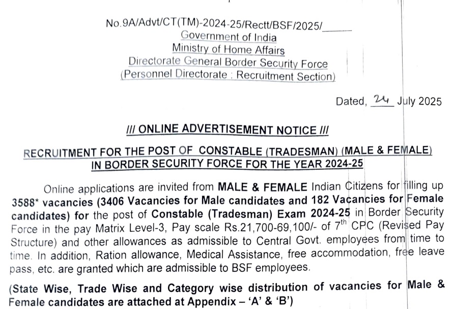 BSF Recruitment 2025: बीएसएफ कॉन्स्टेबल ट्रेड्समैन के 3588 पदों पर आवेदन शुरू, 10th-ITI पास कर सकते हैं अप्लाई