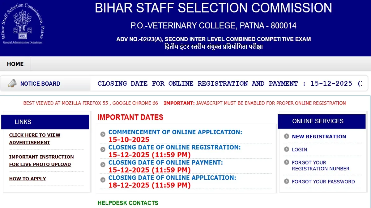 एजुकेशन डेस्क, नई दिल्ली। बिहार में द्वितीय इंटर स्तरीय संयुक्त प्रतियोगिता परीक्षा (BSSC 2nd Inter Level recruitment 2025) के जरिये 23175 पदों पर भर्ती की जानी है। बिहार स्टाफ सिलेक्शन कमीशन (BSSC) की ओर से इस भर्ती के लिए आवेदन करने की लास्ट डेट आज यानी 15 दिसंबर 2025 निर्धारित है। ऐसे में जो भी उम्मीदवार भर्ती के लिए पात्रता पूरी करते हैं और अभी तक किसी कारणवश फॉर्म नहीं भर सके हैं वे बिना देरी करते हुए तुरंत ही ऑनलाइन फॉर्म भर लें, आज के बाद एप्लीकेशन विंडो क्लोज कर दी जाएगी।