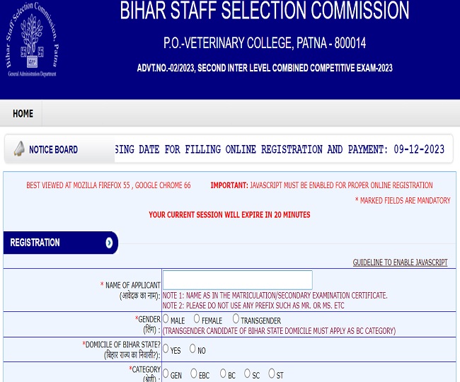 रजिस्ट्रेशन करने के साथ ही आवेदन शुल्क जमा करने की अंतिम तिथि भी 9 दिसंबर 2023 तय की गयी है। इसलिए अभ्यर्थी बिना अंतिम समय का इंतजार करते हुए तुरंत ही आधिकारिक वेबसाइट bssc.bihar.gov.in पर जाकर पंजीकरण कर सकते हैं।