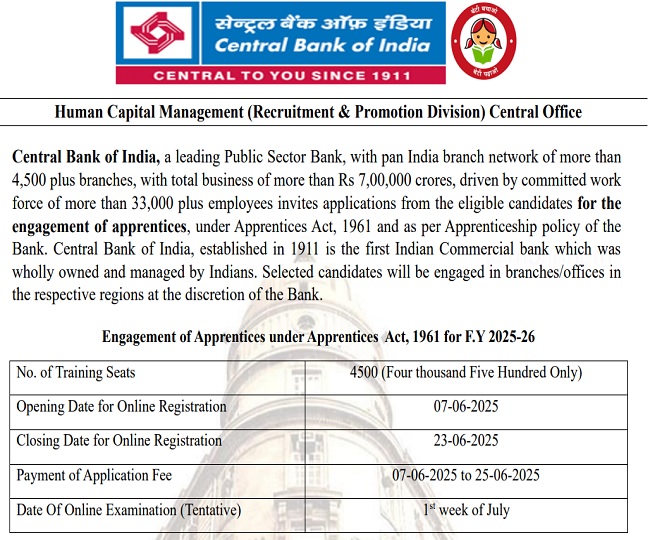 सेंट्रल बैंक ऑफ इंडिया में अप्रेंटिसशिप के 4500 पदों पर नौकरी पाने का सुनहरा मौका, ग्रेजुएट अभ्यर्थी ले सकते हैं भर्ती में भाग