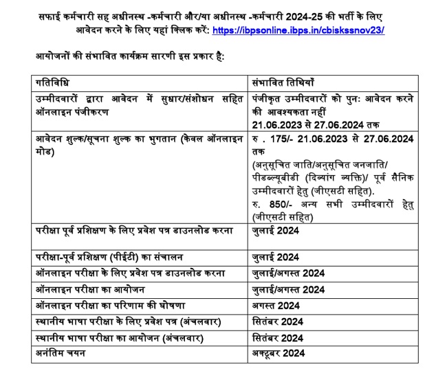 सेंट्रल बैंक ऑफ इंडिया (CBI) ने सफाई कर्मचारी सह अधीनस्थ-कर्मचारी और/या अधीनस्थ कर्मचारी भर्ती 2024-25 के लिए आवेदन एक बार फिर 21 से 27 जून तक ओपेन करने की घोषणा की है। CBI की आधिकारिक वेबसाइट centralbankofindia.co.in पर करियर सेक्शन में एक्टिव लिंक से इस भर्ती (CBI Sub-Staff Recruitment 2024) के लिए आवेदन कर सकते हैं। आवेदन शुल्क 850 रुपये है।