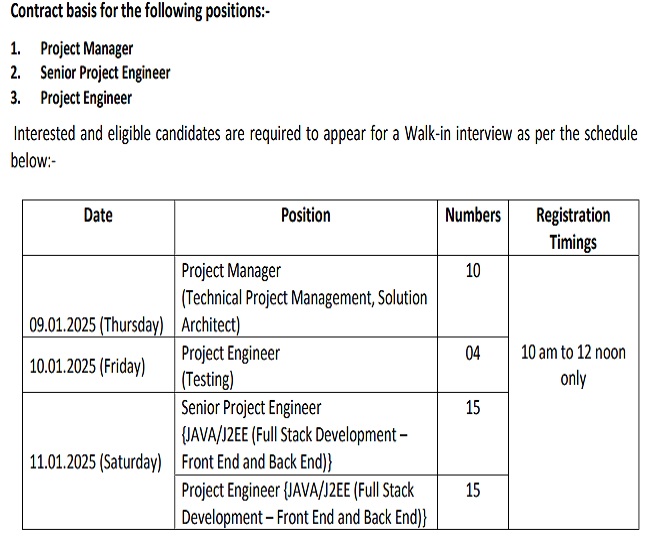 CDAC की ओर से भर्ती के लिए जारी नोटिफिकेशन के मुताबिक वॉक इन इंटरव्यू का आयोजन तीन दिन- 9, 10 एवं 11 जनवरी 2025 को करवाया जायेगा। इसमें से प्रोजेक्ट मैनेजर पद के लिए इंटरव्यू 9 जनवरी, प्रोजेक्ट इंजीनियर पदों के लिए इंटरव्यू 10 जनवरी और सीनियर प्रोजेक्ट इंजीनियर एवं प्रोजेक्ट इंजीनियर पदों के लिए इंटरव्यू 11 जनवरी 2025 को लिए जाएंगे।