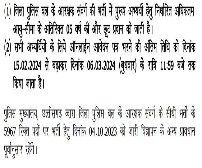 एजुकेशन डेस्क, नई दिल्ली। छत्तीसगढ़ पुलिस विभाग की ओर से कॉन्स्टेबल के 5967 रिक्त पदों पर भर्ती चल रही थी जिसके लिए आवेदन की अंतिम तिथि एक्सटेंड कर दी गयी है। जो अभ्यर्थी निर्धारित अंतिम तिथि तक इस भर्ती में शामिल नहीं हो सकते हैं उनके लिए एक और मौका है। अभ्यर्थी सीजी कॉन्स्टेबल पदों पर अब 6 मार्च 2024 तक ऑनलाइन माध्यम से आवेदन पत्र भर सकते हैं।