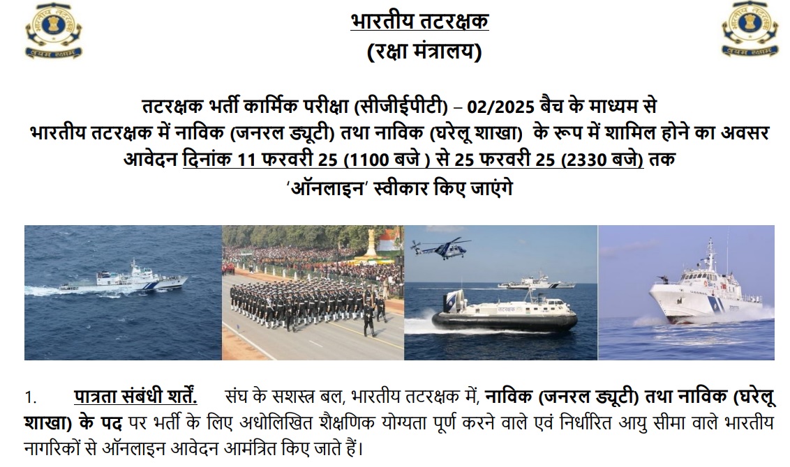 भारतीय तटरक्षक बल की ओर से Indian Coast Guard CGEPT- 02/ 2025 के लिए आवेदन प्रक्रिया शुरू कर दी गई है जो निर्धारित अंतिम तिथि 25 फरवरी 2025 तक जारी रहेगी। जो भी अभ्यर्थी नाविक जनरल ड्यूटी एवं नाविक डोमेस्टिक ब्रांच पदों के लिए पात्रता पूरी करते हैं वे तय तिथियों के अंदर ऑनलाइन माध्यम से फॉर्म भर सकते हैं।