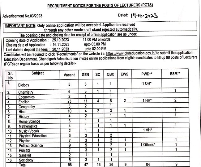 Chandigarh PGT Recruitment 2023: चंडीगढ़ पीजीटी भर्ती के लिए नोटिफिकेशन जारी, 25 अक्टूबर से कर सकेंगे अप्लाई