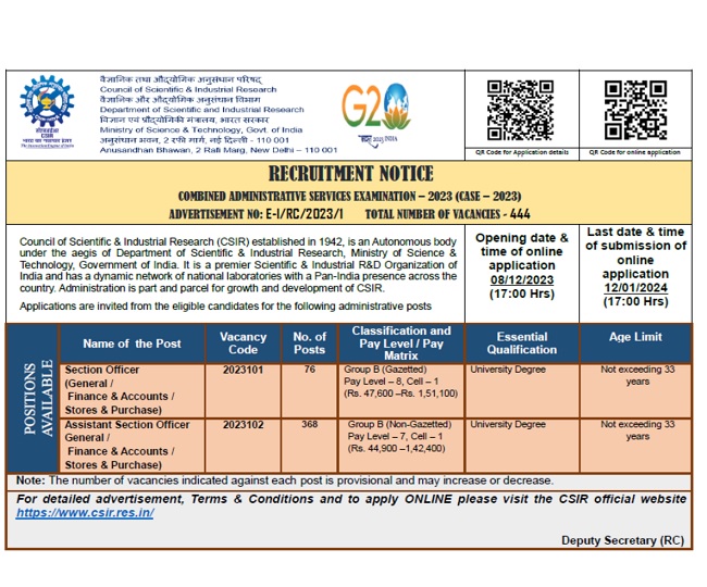 CSIR Recruitment 2024: सीएसआइआर में 444 SO/ASO पदों के लिए आवेदन 12 जनवरी तक, CASE 2023 से होगा चयन