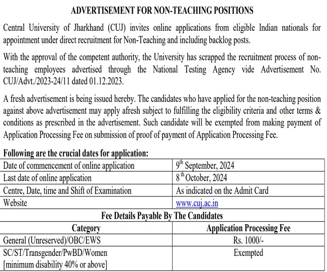 सेंट्रल यूनिवर्सिटी ऑफ झारखंड में नॉन-टीचिंग पदों पर हो रही भर्ती, 8 अक्टूबर तक कर सकते हैं आवेदन