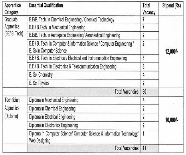 इस भर्ती में ग्रेजुएट अप्रेंटिस पदों पर आवेदन के लिए उम्मीदवारों ने संबंधित क्षेत्र में इंजीनियरिंग डिग्री- बीई/ बीटेक/ बीएससी केमिस्ट्री/ बीएससी फिजिक्स किया हो। इसके अलावा डिप्लोमा अप्रेंटिस पदों पर फॉर्म भरने के लिए अभ्यर्थी के पास इंजीनियरिंग में डिप्लोमा होना अनिवार्य है। पात्रता से जुड़ी विस्तृत जानकारी के लिए अभ्यर्थी ऑफिशियल नोटिफिकेशन का अवलोकन अवश्य कर लें।
