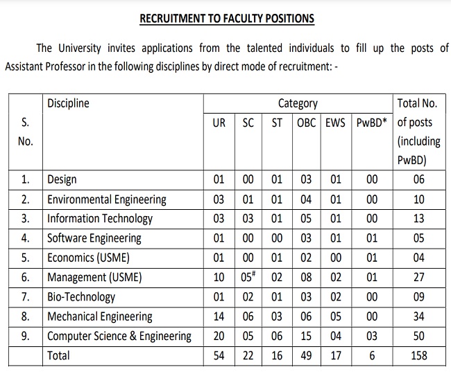दिल्ली टेक्नोलॉजिकल यूनिवर्सिटी (DTU) में विभिन्न डिपार्टमेंट्स के अंतर्गत असिस्टेंट प्रोफेसर के कुल 158 रिक्त पदों पर भर्ती निकाली गयी है। इस भर्ती के लिए एप्लीकेशन प्रॉसेस शुरू हो गयी है जो निर्धारित अंतिम तिथि 14 अप्रैल 2024 तक जारी रहेगी। योग्य एवं इच्छुक अभ्यर्थी इस भर्ती में शामिल होने के लिए ऑनलाइन माध्यम से आवेदन प्रक्रिया पूर्ण कर सकते हैं।