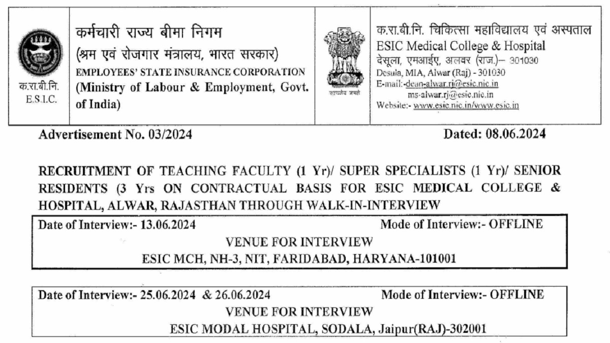 एजुकेशन डेस्क, नई दिल्ली। कर्मचारी राज्य बीमा निगम (ESIC) की ओर से ईएसआईसी मेडिकल कॉलेज एन्ड हॉस्पिटल, अलवर, राजस्थान में टीचिंग फैकल्टी, सीनियर रेजिडेंट, सुपर स्पेशलिस्ट सहित अन्य रिक्त पदों पर भर्ती निकाली गई है। इन सभी पदों पर उम्मीदवारों का चयन वॉक इन इंटरव्यू के माध्यम से किया जाएगा। ऐसे में जो भी अभ्यर्थी इस भर्ती के लिए पात्रता पूरी करते हैं वे निर्धारित तिथि एवं पते पर उपस्थित होकर इंटरव्यू के लिए उपस्थित हो सकते हैं।