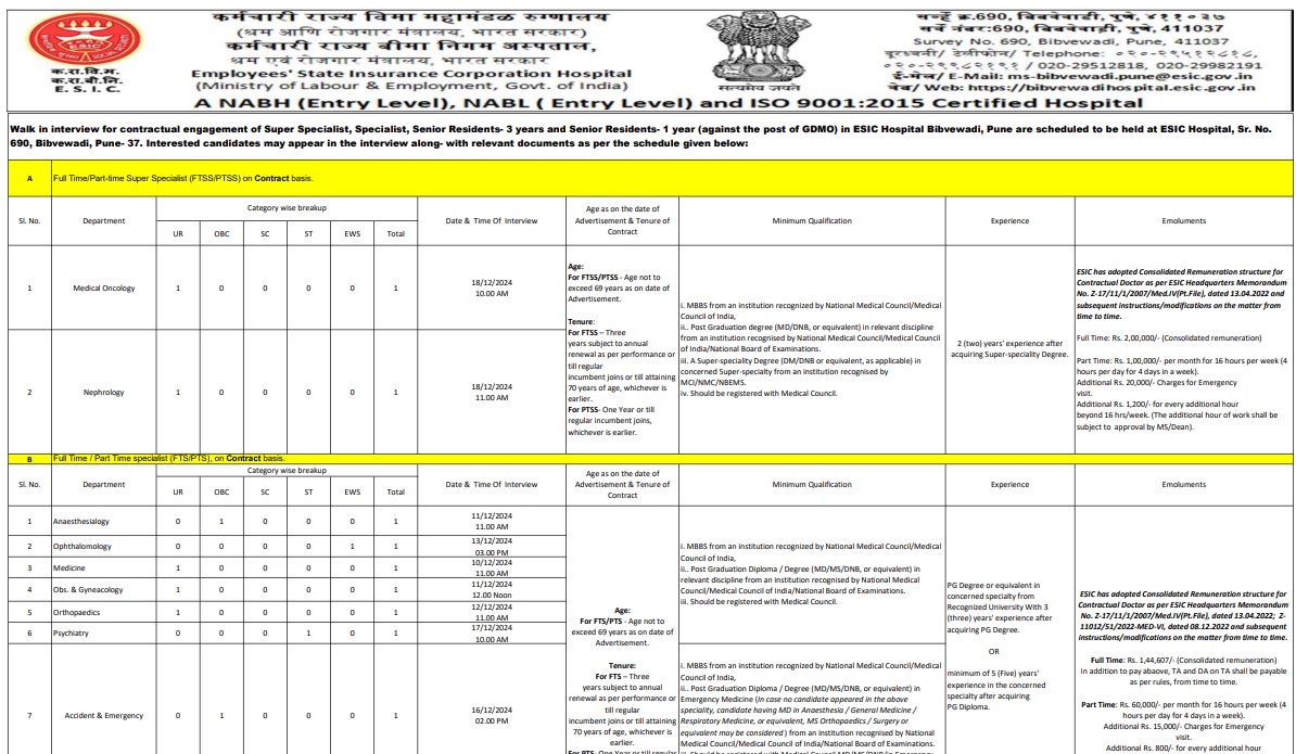 ESIC Recruitment 2024: ईएसआईसी पुणे में सीनियर रेजिडेंट, स्पेशलिस्ट सहित अन्य पदों पर निकली भर्ती, वॉक इन इंटरव्यू से होगा चयन