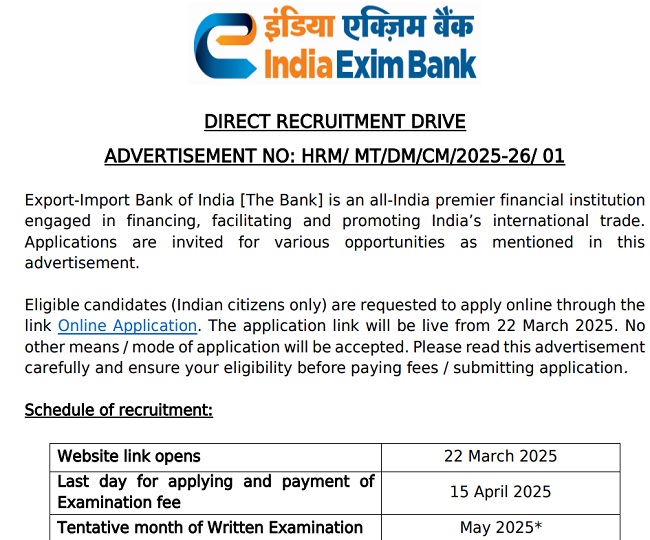 Exim Bank Recruitment 2025: एग्जिम बैंक में मैनेजमेंट ट्रेनी पदों पर हो रही भर्ती, जल्द कर लें अप्लाई, 25 अप्रैल है लास्ट डेट