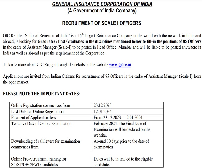 जनरल इंश्योरेंस कॉर्पोरेशन (GIC) की ओर से ऑफिसर स्केल-1 के 85 रिक्त पदों पर भर्ती निकाली गयी है जिसके लिए ऑनलाइन आवेदन प्रक्रिया शुरू की जा चुकी है। इस भर्ती के लिए योग्य एवं इच्छुक अभ्यर्थी ऑफिशियल वेबसाइट पर जाकर ऑनलाइन माध्यम से फॉर्म भर सकते हैं। ऑनलाइन आवेदन पत्र भरने की अंतिम तिथि 12 जनवरी 2024 तय की गयी है।