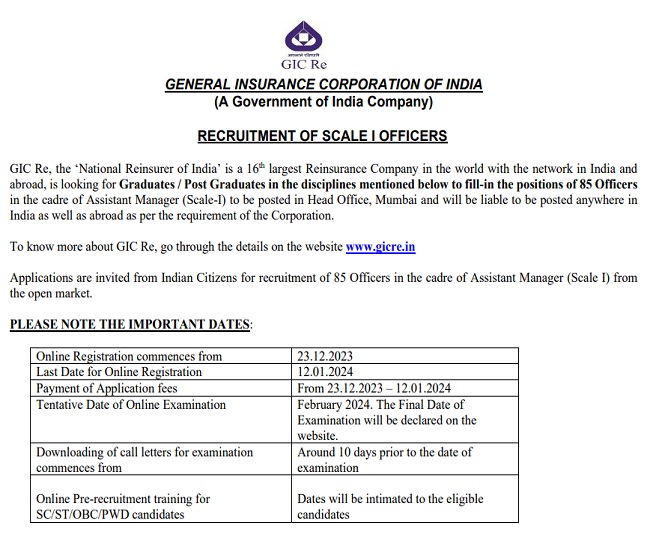 GIC Recruitment 2024: आज ही करें जनरल इंश्योरेंस में 85 स्केल 1 ऑफिसर (असिस्टेंट मैनेजर) भर्ती के लिए आवेदन
