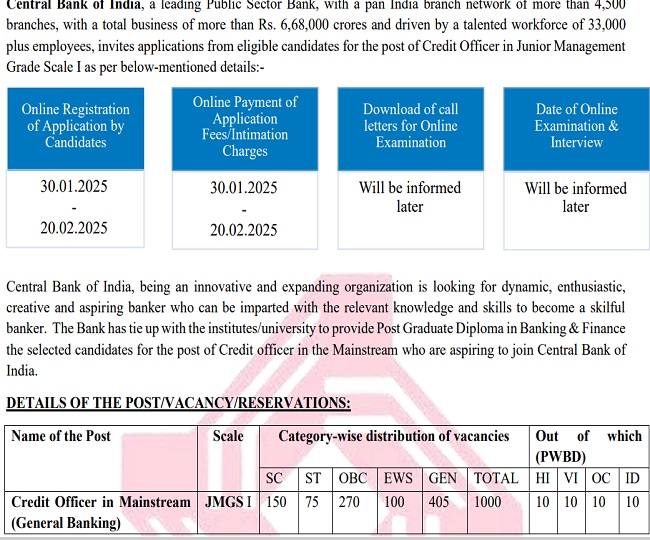 जॉब डेस्क, नई दिल्ली। बैंक में सरकारी नौकरी पाने का सपना देख रहे युवाओं के लिए महत्वपूर्ण खबर है। केनरा बैंक की ओर से क्रेडिट ऑफिसर पदों पर भर्ती निकाली गई है जिसके लिए आवेदन प्रक्रिया 30 जनवरी 2025 से शुरू कर दी गई है। जो भी अभ्यर्थी इस भर्ती के लिए योग्यता रखते हैं वे इसमें शामिल होने के लिए ऑनलाइन माध्यम से बैंक की ऑफिशियल वेबसाइट centralbankofindia.co.in पर जाकर या इस पेज पर दिए डायरेक्ट लिंक से फॉर्म भर सकते हैं। आवेदन करने एवं फीस जमा करने की लास्ट डेट 20 फरवरी 2025 तय की गई है।