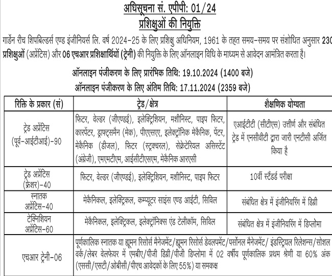 जॉब डेस्क, नई दिल्ली। सरकारी नौकरी की तलाश कर रहे युवाओं के लिएबेहतरीन मौका है। गार्डेन रीच शिपबिल्डर्स एन्ड इंजीनियर्स लिमिटेड में ट्रेड अप्रेंटिस, स्नातक अप्रेंटिस, टेक्नीशियन अप्रेंटिस एवं एचआर ट्रेनी के पदों पर भर्ती निकाली गई है। इस भर्ती के लिए आवेदन प्रक्रिया 19 अक्टूबर से शुरू कर दी गई है जो निर्धारित अंतिम तिथि 17 नवंबर 2024 तक जारी रहेगी।
