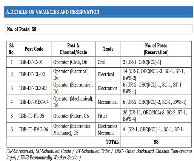 इस भर्ती के माध्यम से कुल 58 रिक्त पदों पर नियुक्तियां की जानी हैं। इसमें से ऑपरेटर (सिविल) के 02, ऑपरेटर (इलेक्ट्रिकल) के 14, ऑपरेटर (इलेक्ट्रॉनिक्स) के 06, ऑपरेटर (मैकेनिकल) के 06, ऑपरेटर (फिटर) के 26 और ऑपरेटर (इलेक्ट्रॉनिक्स मैकेनिक) के 04 पदों पर नियुक्तियां की जाएंगी।