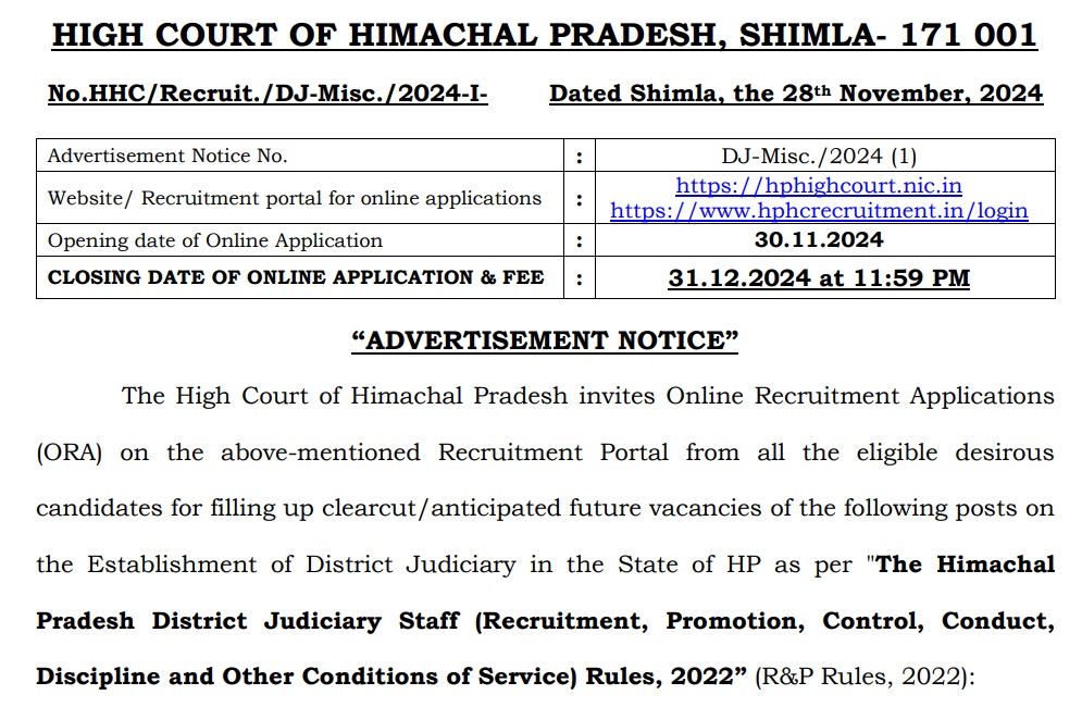 HP High Court Recruitment 2024: एचपी हाई कोर्ट में विभिन्न पदों पर सरकारी नौकरी पाने का मौका, 31 दिसंबर तक कर सकते हैं अप्लाई