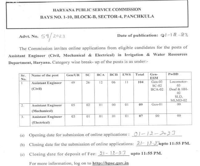 जॉब डेस्क, नई दिल्ली। हरियाणा में असिस्टेंट इंजीनियर की भर्ती के इच्छुक उम्मीदवारों के लिए काम की खबर। हरियाणा सरकार के सिंचाई एवं जल संसाधन विभाग में सिविल, मेकेनिकल और इलेक्ट्रिकल ट्रेड में असिस्टेंट इंजीनियर के पदों पर भर्ती के लिए अधिसूचना हरियाणा लोक सेवा आयोग (HPSC) ने जारी की है। आयोग द्वारा आज यानी शुक्रवार, 1 दिसंबर 2023 को जारी भर्ती (HPSC AE Recruitment 2023) अधिसूचना (सं.59/2023) के अनुसार 120 पदों पर भर्ती की जानी है।