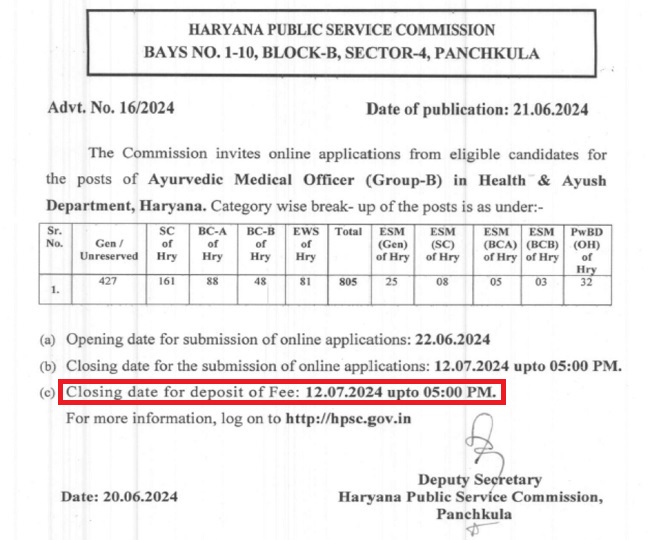 HPSC AMO: हरियाणा स्वास्थ्य एवं आयुष विभाग में 805 आयुर्वेदिक मेडिकल ऑफिसर की भर्ती के लिए आवेदन का अंतिम दिन