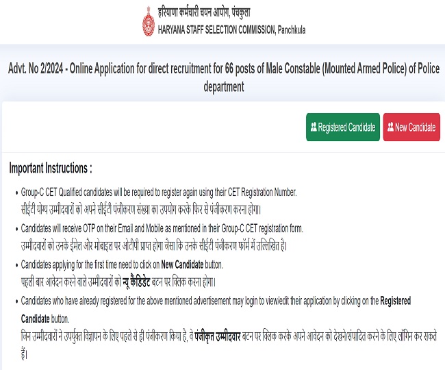 हरियाणा कर्मचारी चयन आयोग (HSSC) की ओर से मेल कॉन्स्टेबल के 66 रिक्त पदों पर भर्ती निकाली गयी है जिसके लिए आवेदन प्रक्रिया 1 अप्रैल से शुरू हो गयी है। जो भी उम्मीदवार पुलिस विभाग में सरकारी नौकरी पाना चाहते हैं वे 1 मई 2024 तक इस भर्ती में शामिल होने के लिए आवेदन प्रक्रिया पूर्ण कर सकते हैं। आवेदन से पहले पात्रता अवश्य जांच लें।