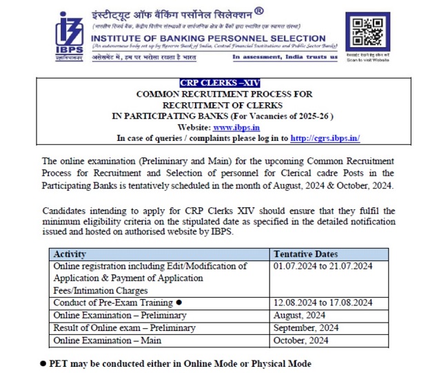 देश भर के क्षेत्रीय ग्रामीण बैंकों (RRBs) में 9500 से अधिक पदों पर भर्ती के लिए आवेदन प्रक्रिया 30 जून तक पूरी करने के बाद अब इंस्टीट्यूट ऑफ बैंकिंग पर्सोनेल सेलेक्शन (IBPS) राष्ट्रीय बैंकों में क्लर्क के 6 हजार पदों पर भर्ती (CRP Clerks XIV) के लिए अधिसूचना (IBPS Clerk Notification 2024) आज 1 जुलाई को जारी कर दी गई है।