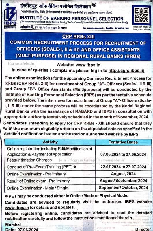 इंस्टीट्यूट ऑफ बैंकिंग पर्सोनेल सिलेक्शन (IBPS) द्वारा आयोजित की जाने वाली चयन प्रक्रिया CRP RRB XIII के लिए अधिसूचना शुक्रवार 7 जून को जारी की कर दी गई। संस्थान द्वारा जारी संक्षिप्त विज्ञापन के मुताबिक इस बार की परीक्षा (IBPS RRB 2024 Notification CRP XIII) के लिए उम्मीदवार 27 जून 2024 तक संस्थान की आधिकारिक वेबसाइट ibps.in पर ऑनलाइन आवेदन कर सकेंगे।
