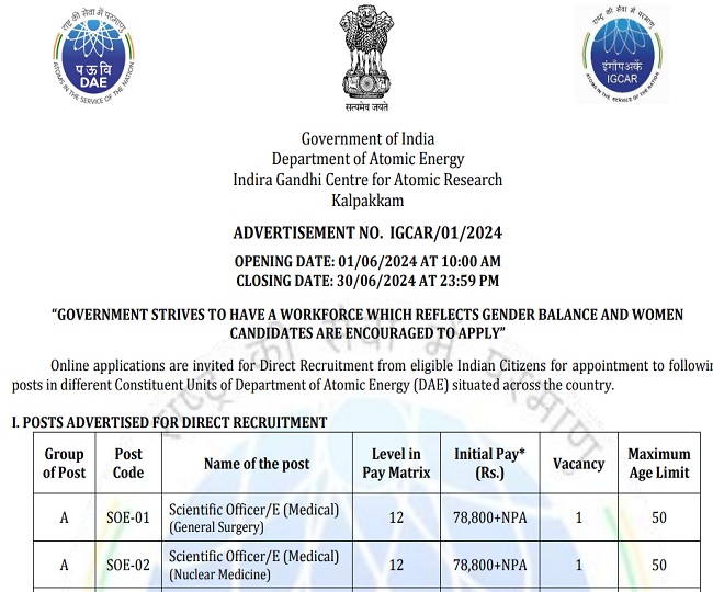 इंदिरा गांधी सेंटर फॉर एटॉमिक रिसर्च (IGCAR) में विभिन्न पदों पर भर्ती निकाली गई है। जो भी उम्मीदवार इस भर्ती में शामिल होना चाहते हैं वे ऑनलाइन माध्यम से निर्धारित अंतिम तिथि 0 जून 2024 तक फॉर्म भर सकेंगे। आवेदन केवल ऑनलाइन ही स्वीकार किये जाएंगे। आवेदन से पहले अभ्यर्थी पदानुसार पात्रता एवं मापदंड की जांच अवश्य कर लें उसके बाद ही फॉर्म भरें।
