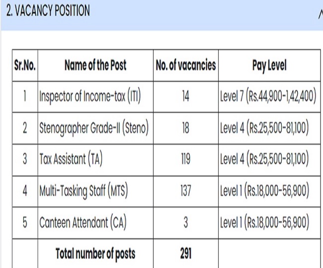 जॉब डेस्क, नई दिल्ली। इनकम टैक्स डिपार्टमेंट, मुंबई रीजन में स्पोर्ट्स कोटा के तहत कुल 291 रिक्त पदों को भरने के लिए भर्ती निकाली गई है। यह भर्ती इंस्पेक्टर, स्टेनोग्राफर, टैक्स असिस्टेंट सहित विभिन्न पदों पर होनी है। इस भर्ती में शामिल होने के लिए आवेदन की अंतिम तिथि 19 जनवरी 2024 निर्धारित है, ऐसे में जो उम्मीदवार इस भर्ती के लिए किसी कारणवश अभी तक फॉर्म नहीं भर सकते हैं वे बिना देरी करते हुए तुरंत ही आवेदन पत्र भर सकते हैं।