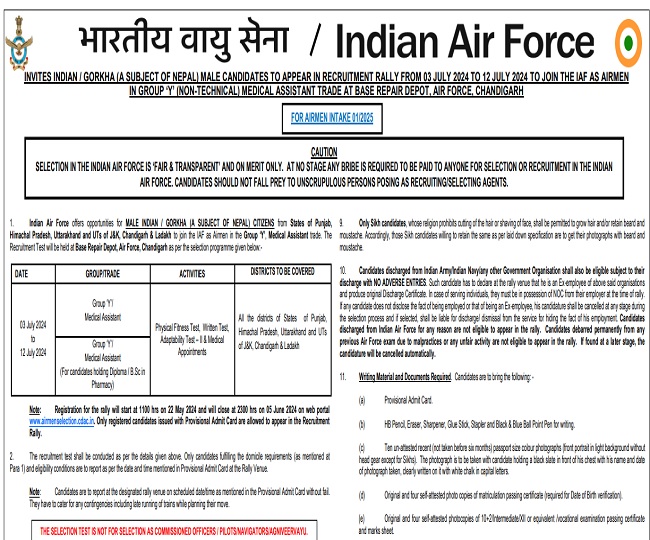 इंडियन एयर फोर्स की ओर से ग्रुप Y के तहत एयरमैन एवं मेडिकल असिस्टेंट ट्रेड (01/2025) के रिक्त पदों पर भर्ती निकाली गई है। इस भर्ती के लिए आवेदन प्रक्रिया 22 मई से शुरू की जाएगी। पात्र अभ्यर्थी इस भर्ती में शामिल होने के लिए ऑनलाइन माध्यम से फॉर्म भर सकेंगे। आवेदन की अंतिम तिथि 6 जून 2024 निर्धारित की गई है।