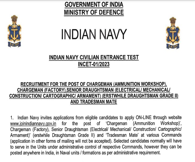 Indian Navy INCET recruitment: भारतीय नौसेना में विभिन्न पदों पर भर्ती के लिए आवेदन शुरू, यहां से करें अप्लाई